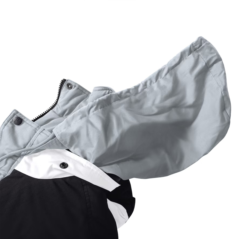 - Collar: Stand-up style with hood at the back with adjustable strings