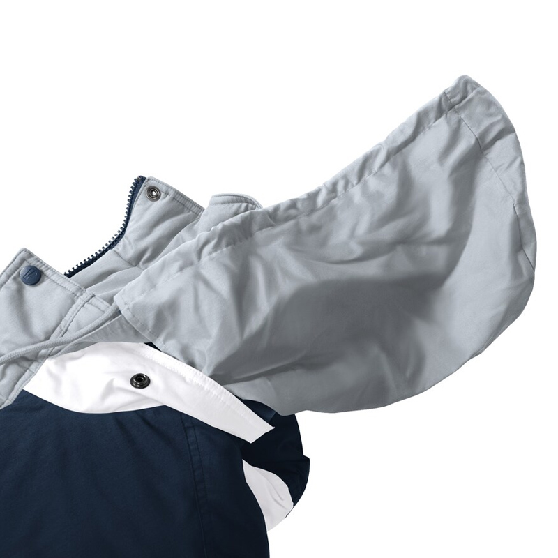 - Collar: Stand-up style with hood at the back with adjustable strings