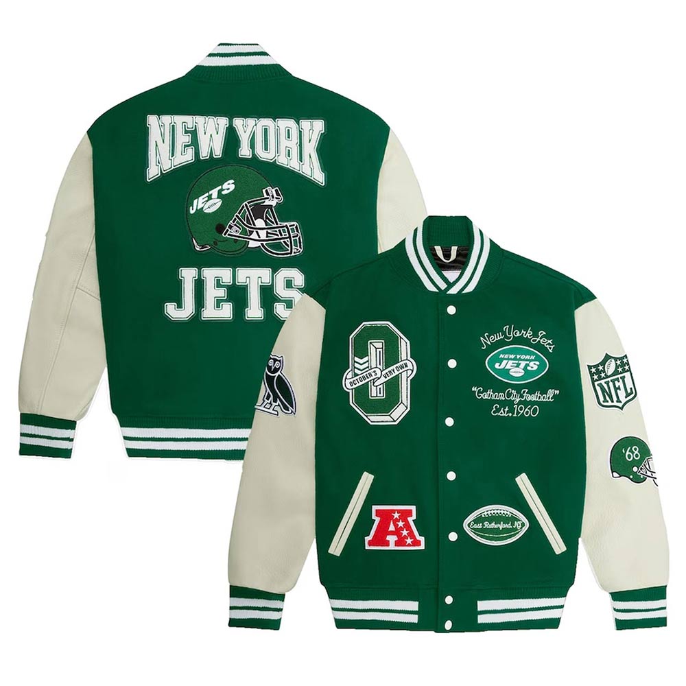 - Logo: OVO New York Jets logo on the front, back, and sleeve