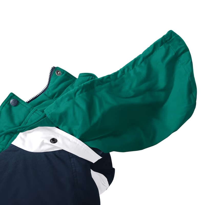 - Collar: Stand-up style with hood at the back with adjustable strings