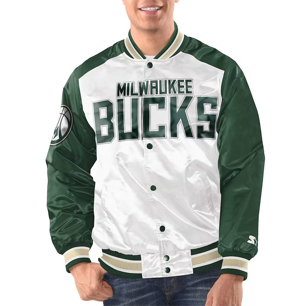 White/Hunter Green Milwaukee Bucks Renegade Varsity Satin Jacket